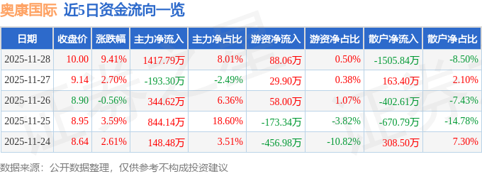 11月28日的资金流向数据方面,主力资金净流入1417.79万元,占总成交额8.01%,游资资金净流入88.06万元,占总成交额0.5%,散户资金净流出1505.84万元,占总成交额8.5%。